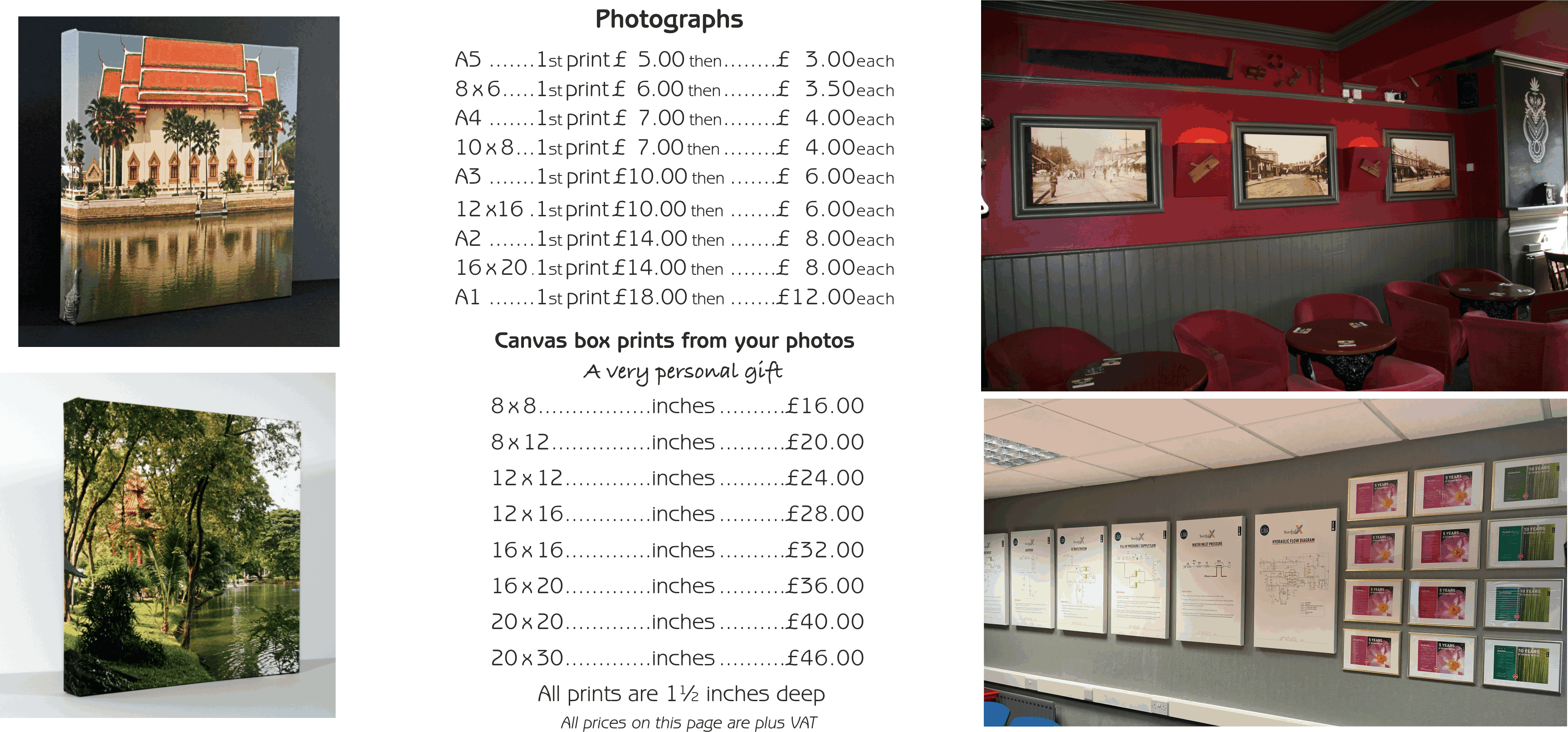 With our 12 colour Canon Printer, we can now offer a wide range of high quality photographs from 8x6 inches up to 20 x 30 inches on 190gsm Satin or Gloss photographic paper. Also we have range of sizes for our Canvas Box prints. All are printed in colour or true black & white with the added advantage of being able to print grey's which will help hold tone and detail in your photographs.